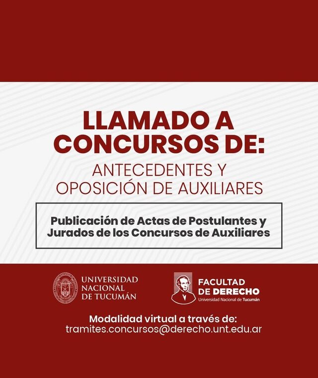 A fin de dar cumplimiento a lo establecido en los art. 8, 9 y 19 concordantes de la Resolución N° 556-2000 “Reglamento General para Concursos Docentes Auxiliares Regulares” y Resolución 0741-2020 “Pautas Reglamentarias para Concursos Docentes”, se procede a la publicación —por tres días hábiles (2, 3 y 4 de septiembre) en la página de la facultad: www.derecho.unt.edu.ar — de la nómina de integrantes titulares del jurado (incluyendo área de especialidad) y de los aspirantes inscriptos en los concursos correspondientes a los expedientes abajo detallados.
