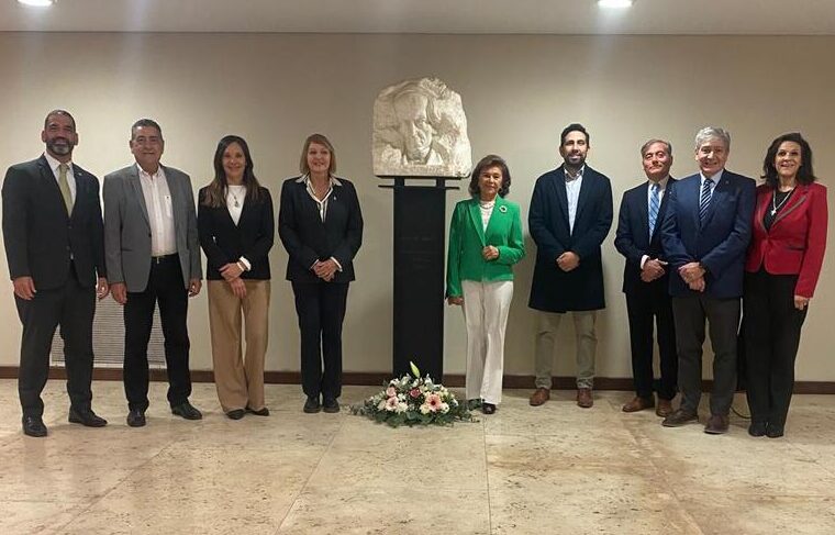 La jornada comenzó con un homenaje cargado de simbolismo. La decana, Dra. Cristina Grunauer de Falú, y el presidente del Colegio de Abogados, Dr. Alberto López Domínguez, encabezaron la colocación de una ofrenda floral al busto de Alberdi en el hall de la Facultad.