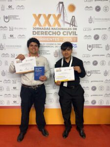 La producción académica tucumana fue reconocida por el jurado con tres premios: el primer premio para “La constitucionalización del Código Civil y Comercial como garantía real de los derechos del consumidor en el ámbito de redes sociales y entorno digital”, de los estudiantes Nahuel Ruiz, Francisco Coronel Rodríguez y Yasser Oliva; y dos menciones especiales: una para “La vulneración infantil y los mecanismos de la protección de la niñez frente a las instituciones civiles: análisis crítico sobre derechos fundamentales, prevención de abuso y fortalecimiento del interés superior del niño en la era digital”, de Valentina Abigail Gómez y Fátima Florencia Olivieri; y otra para “Hacia una perspectiva ecológica del Código Civil y Comercial de la Nación: Incorporación de los principios ambientales en el derecho privado y en el ejercicio de los derechos civiles”, de Andrés Mauricio Castro y María Luján Ibrahim.