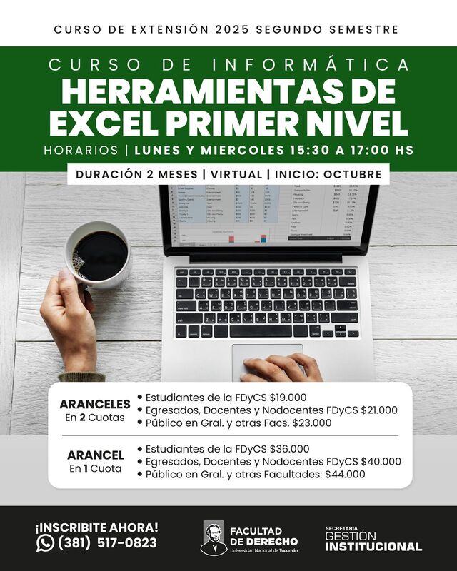 Entre ellas se encuentra el Curso de Informática: Herramientas de Excel Primer Nivel, modalidad virtual, que iniciará las primeras semanas de octubre a cargo de la Cra. Cecilia Canevaro. Se dictará los lunes y miércoles de 15:30 a 17:00, con un temario que abarca desde el uso básico de planillas hasta fórmulas, funciones, tablas dinámicas y diseño para impresión.