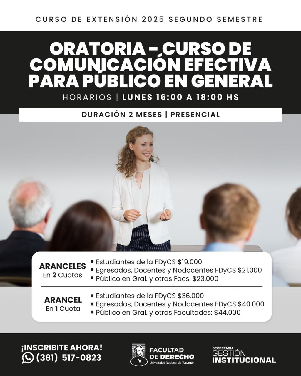 La comunicación efectiva será protagonista del Curso de Oratoria, modalidad presencial, coordinado por la Dra. María del Milagro Muñoz Molina. Iniciará el 6 de octubre, todos los lunes de 16:00 a 18:00, y propone entrenar el lenguaje corporal, las cualidades de la voz, el storytelling y las técnicas de persuasión.
